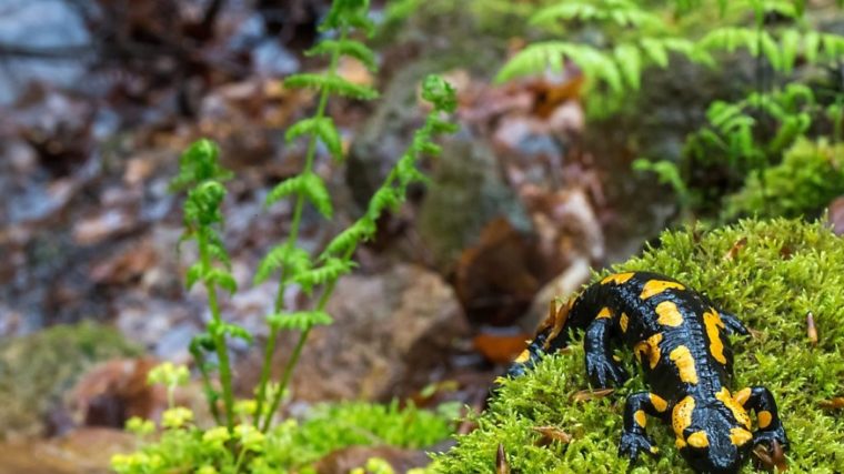 Der Feuersalamander (Salamandra salamandra) ist einer der grössten heimischen Schwanzlurche. Er lebt vorwiegend in feuchten Laubmischwäldern der Mittelgebirge – etwa im Harz.