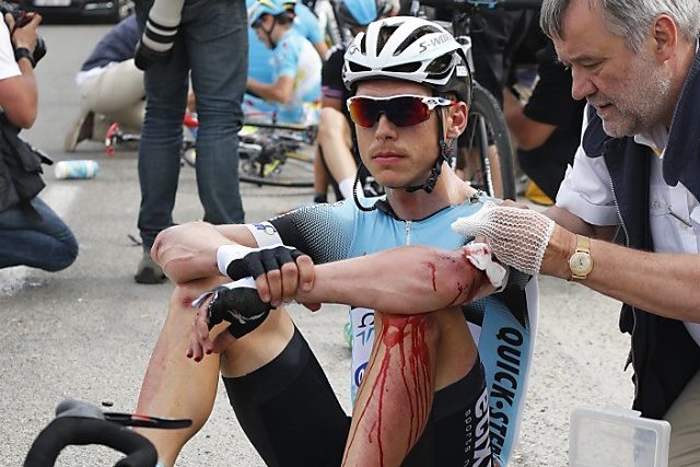 Martin war am Samstag Hauptleidtragender eines Sturzes fünf Kilometer vor dem Ziel in Bastia. Der in Kreuzlingen wohnhafte Deutsche, der die Tour im Vorjahr nach einem Kahnbeinbruch in der Hand nach der neunten Etappe aufgeben musste, trug eine tiefe Schnittwunde am Ellenbogen, eine Lungenprellung und Schürfwunden am gesamten Körper davon. Nach einem kurzen Spitalaufenthalt, bei dem Brüche ausgeschlossen wurden, kehrte er am Abend zur Mannschaft zurück. «Er ist fast am ganzen Körper verpflastert», sagte Riepenhof vor dem Start der zweiten Etappe.