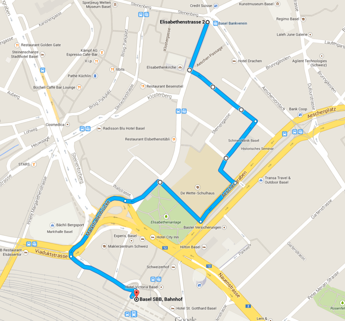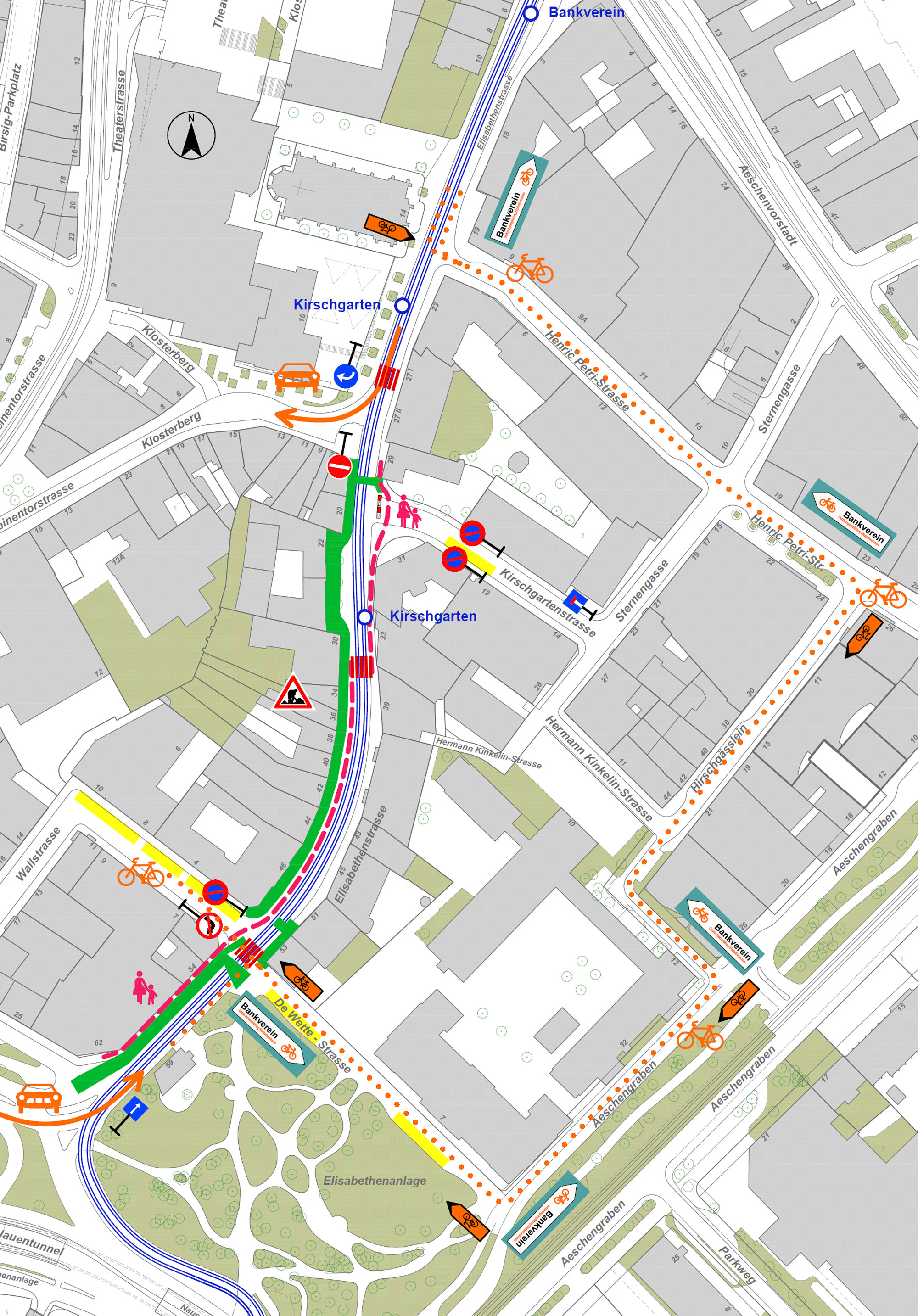 Ja, aber nur in Richtung Bankverein/Innenstadt (Orange, die Führung des motorisierten Verkehrs). In Richtung Bahnhof SBB/Markthallenbrücke ist die Elisabethenstrasse für den gesamten motorisierten Verkehr ab Klosterberg gesperrt. Die Ausweichroute führt via Dufourstrasse und Aeschengraben (zur Route auf Google-Maps):
