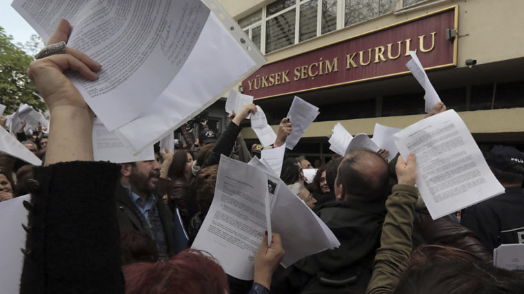 Die Opposition hatte noch am Wahlabend den Vorwurf der Manipulation erhoben. Für Streit sorgte ein Beschluss der Wahlkommission, die während der laufenden Abstimmung entschied, auch nicht offiziell zugelassene Stimmunterlagen als gültig zu werten. Die prokurdische HDP und die CHP forderten daraufhin eine Neuauszählung von zwei Dritteln der Stimmen.