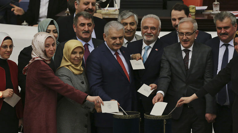 Für das von Erdogans islamisch-konservativer AKP vorgelegte Reformpaket aus 18 Artikeln stimmten am frühen Samstagmorgen 339 Abgeordneten, 142 waren dagegen. Die notwendige Dreifünftelmehrheit von mindestens 330 Stimmen wurde auch mit Hilfe von Abgeordneten aus der ultranationalistischen Oppositionspartei MHP erzielt. Damit nahm die Reform ihre bislang wichtigste Hürde.