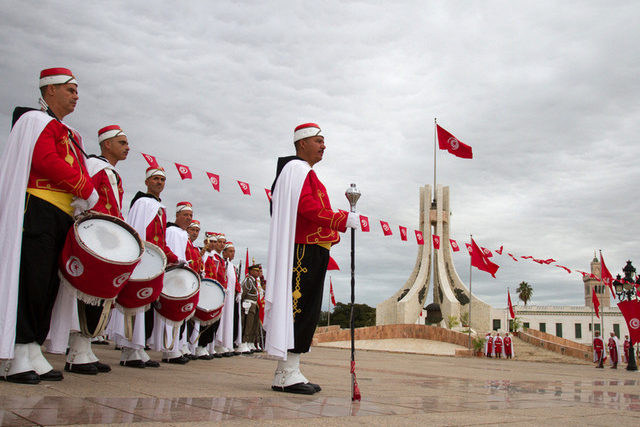 Bei einer Zeremonie in Tunis verneigten sich am Montag Präsident Moncef Marzouki, der Regierungschef Hamadi Jebali und der Präsident der Verfassungsgebenden Versammlung, Mustapha Ben Jaafar, vor der tunesischen Flagge.