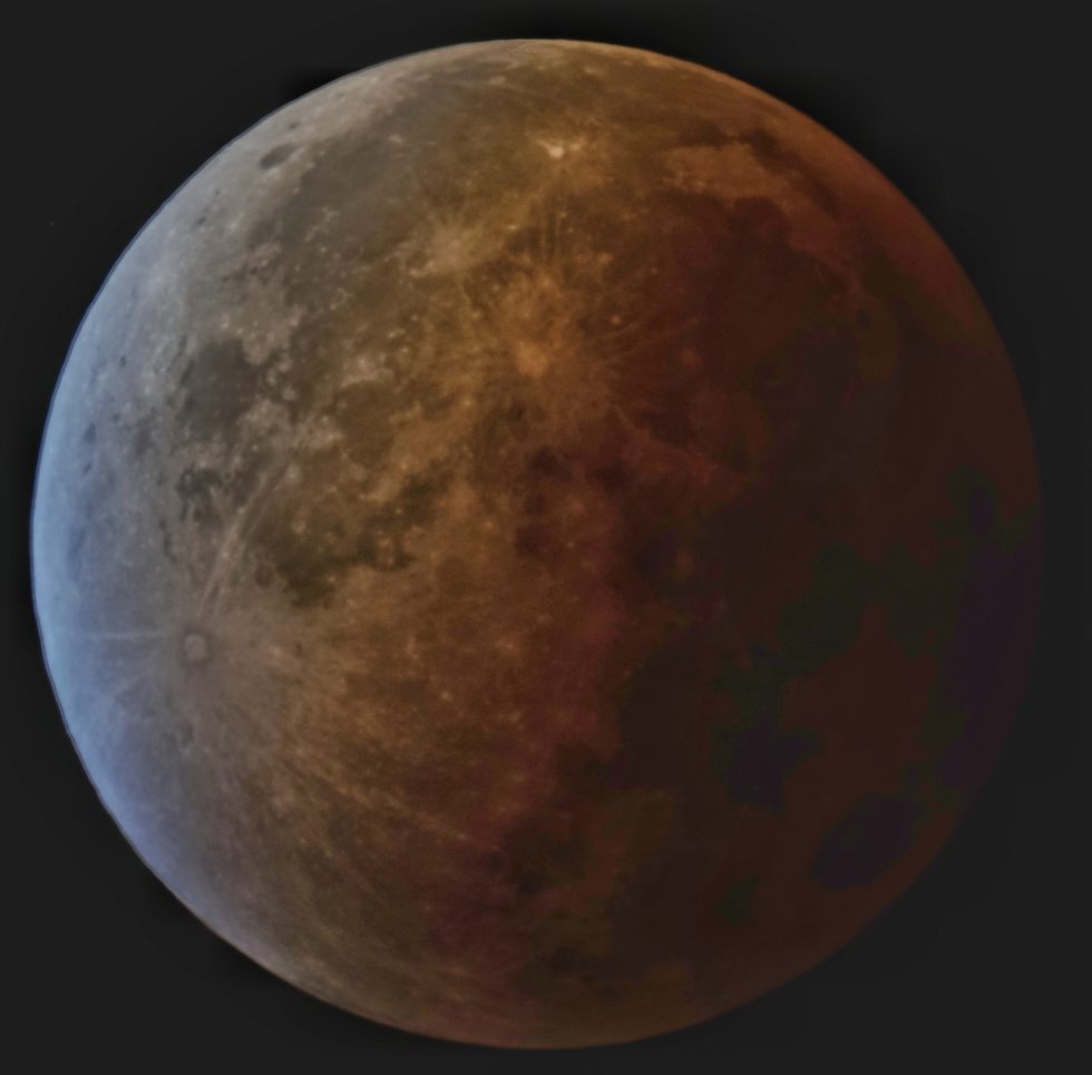 Der Erdtrabant erschien rot, weil es wegen der Lichtbrechung in der Erdatmosphäre auch im Kernschatten nicht ganz dunkel war. Rotes Sonnenlicht wird in der Erdatmosphäre stärker gebrochen als etwa blaues Licht. Deshalb fällt das rötliche Sonnenlicht auf den Vollmond und lässt ihn rötlich schimmern.