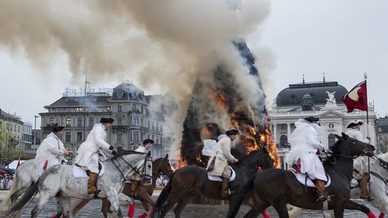 Am Umzug der Zürcher Zünfte durch die Innenstadt mit dem abschliessenden Ritt um den brennenden, mit Knallkörpern gefüllten Böögg auf dem Sechseläutenplatz nehmen jedes Jahr 550 Pferde teil. Tierschützer kritisieren den Anlass als zu belastend für die Tiere.