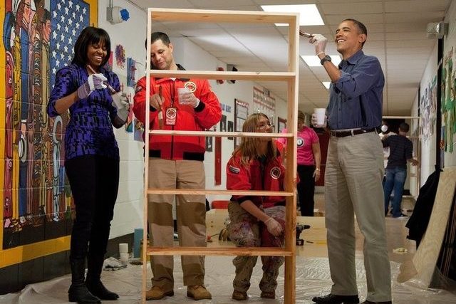 Mit Kaugummi im Mund und hochgekrempelten Hemdsärmeln widmete sich der Präsident am Samstag in der Schule der Bücherregalverschönerung. Auch vor vier Jahren hatten die Obamas den Malerpinsel geschwungen: Sie halfen dabei, eine Unterkunft für Obdachlose anzustreichen.