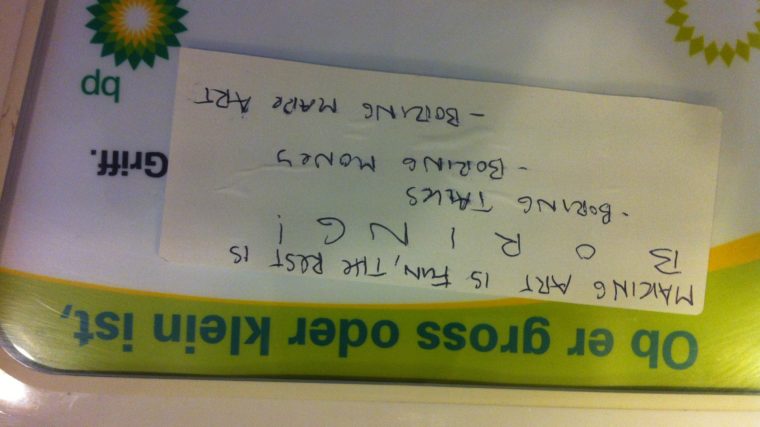 2. Ein Galerist aus Miami hat den Zettel mit einem Haarfön abgelöst und sorgfältig in ein Kartoncouvert verpackt. Er wird eine Kunsthistorikerin damit beauftragen, einen Begleittext zu schreiben, worin die Begriffe «postmodern», «subversiv» und «gesellschaftsrelevant» vorkommen. Dann wird er das Post-it-Statement bei seiner Heimmesse in Miami Beach zwischen Werken von Jeff Koons und Damien Hirst platzieren und für 400’000 Dollar einen Käufer finden.