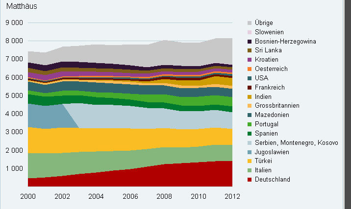 Zählt man aber alle Ex-Jugoslawinnen und -Jugoslawen zusammen, dann sind sie mit 1672 Einwohnerinnen und Einwohnern noch immer relativ stark vertreten im Matthäusquartier. Allerdings nicht ganz so stark wie die westlichen Südeuropäerinnen und -europäer (Italien, Spanien und Portugal), die auf 1702 Quartierbewohnerinnen und -Bewohner kommen. Und erst recht nicht wie die Bevölkerung aus den reichen westlichen Industriestaaten (Deutschland, Grossbritannien, Frankreich, Österreich und USA), die mit 1842 Personen an der Spitze liegt.