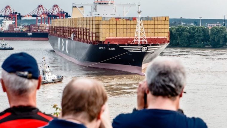 Das grösste Containerschiff der Welt hat am Samstag im Hamburger Hafen angelegt. Nach einem Wendemanöver auf der Elbe bugsierten Schlepper die 395 Meter lange «MSC Zoe» in den Waltershofer Hafen, wo sie am Containerterminal von Eurogate festmachte.