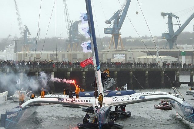 Der 40 Meter lange und 23 Meter hohe Trimaran überquerte am späten Freitagabend die imaginäre Ziellinie zwischen dem Lizard Point (Gb) und Brest (Fr) nach 45 Tagen, 13 Stunden, 42 Minuten und 53 Sekunden. Damit war der 52-jährige Skipper Peyron beinahe drei Tage schneller als Landsmann Franck Cammas im Jahr 2010.