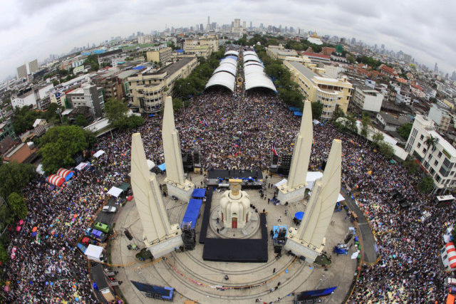 Die Opposition setzte sich das Ziel, beim Demokratie-Monument die grösste Demonstration seit den Unruhen im Frühjahr 2010 zu veranstalten. In einem anderen Teil der Hauptstadt versammelten sich Tausende Anhänger Yinglucks. Beide Lager kündigten an, dass ihre Kundgebungen die ganze Nacht zum Montag hindurch dauern sollten.