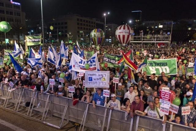 Anderthalb Wochen vor der Parlamentswahl in Israel haben zehntausende Menschen in Tel Aviv für politische Veränderungen demonstriert. An der Kundgebung beteiligten sich am Samstag nach Angaben der Polizei 25’000 Menschen, die Organisatoren sprachen von doppelt so vielen Teilnehmern.