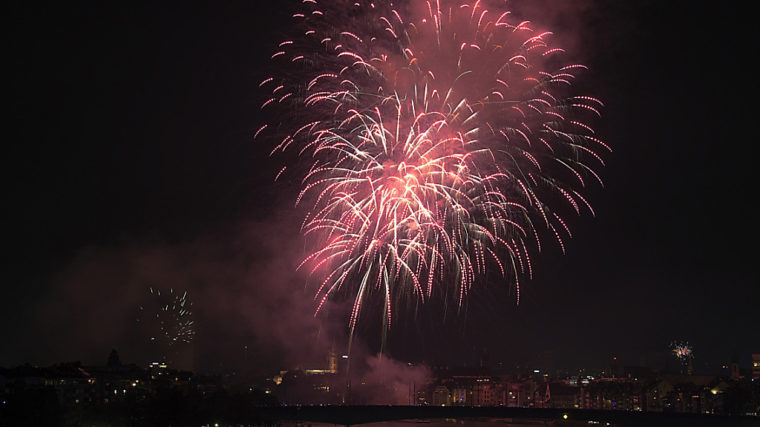 Das grosse Feuerwerk begann pünktlich um 23 Uhr und dauerte offiziell 22 Minuten. Die Zündungen – nach Drehbuch rund 2000 – erfolgten von zwei Schiffen aus; je eines lag oberhalb und unterhalb der Mittleren Brücke im Zentrum der Stadt. Insgesamt lösten sich dabei 70’000 Franken in Schall und Rauch auf.