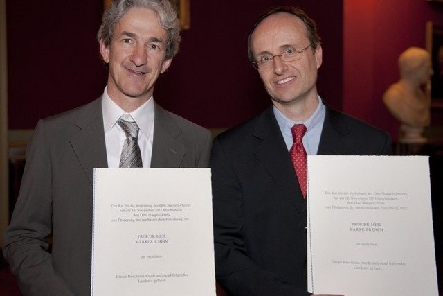 Der Dermatologe Lars French und der Leberspezialist Markus Heim haben am Dienstag den mit 200’000 Franken dotierten Otto Naegeli Preis erhalten. Der Preis gilt als eine der bedeutendsten wissenschaftlichen Auszeichnungen der Schweiz.