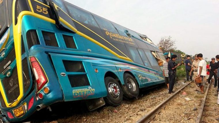 Beim Zusammenstoss eines Zuges mit einem Reisebus sind in Thailand drei Menschen getötet und rund 30 verletzt worden. Der Zug rammte den Doppeldecker am Sonntagmorgen an einem Bahnübergang im Distrikt Nakhon Chaisi westlich von Bangkok.