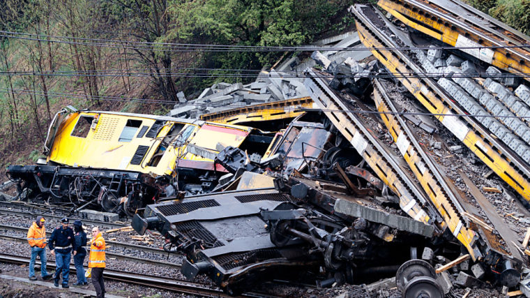 Der mit Eisenbahnschwellen aus Beton mit einem Gewicht von rund 1500 Tonnen beladene Zug konnte nicht mehr gebremst werden und prallte gegen eine weitere Baumaschine, die sich ebenfalls auf der Strecke befand. Mehrere Arbeiter wurden dabei eingeklemmt.