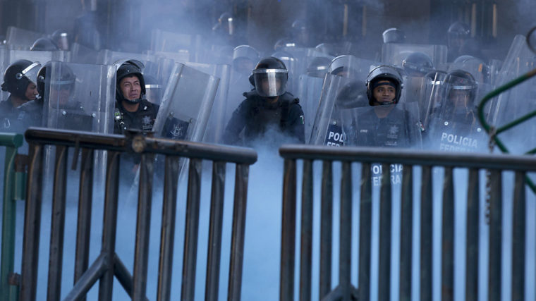 Etwa 300 Protestierende warfen am Freitag auf dem Zócalo-Platz in der mexikanischen Hauptstadt mit Steinen und Brandbomben, die Polizei reagierte mit Tränengas. Medienberichten zufolge wurden bei den Krawallen mindestens fünf Menschen verletzt. Mindestens drei Menschen wurden festgenommen.