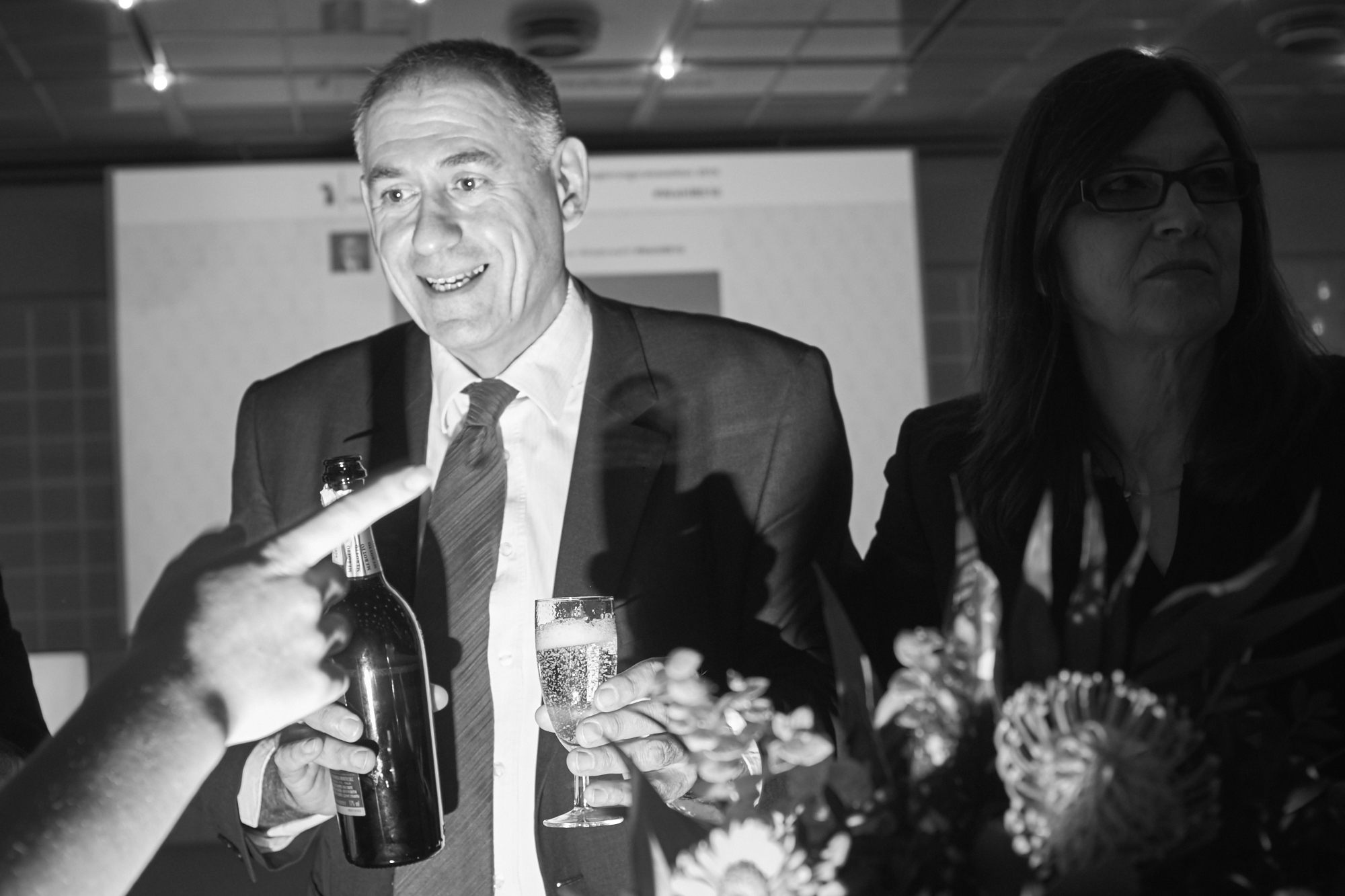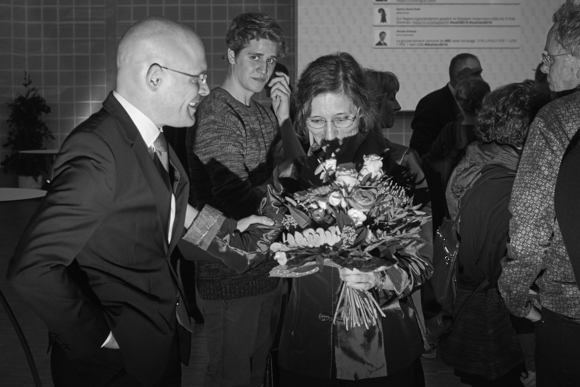 Baschi Dürr überreicht Heidi Mück seinen Strauss.