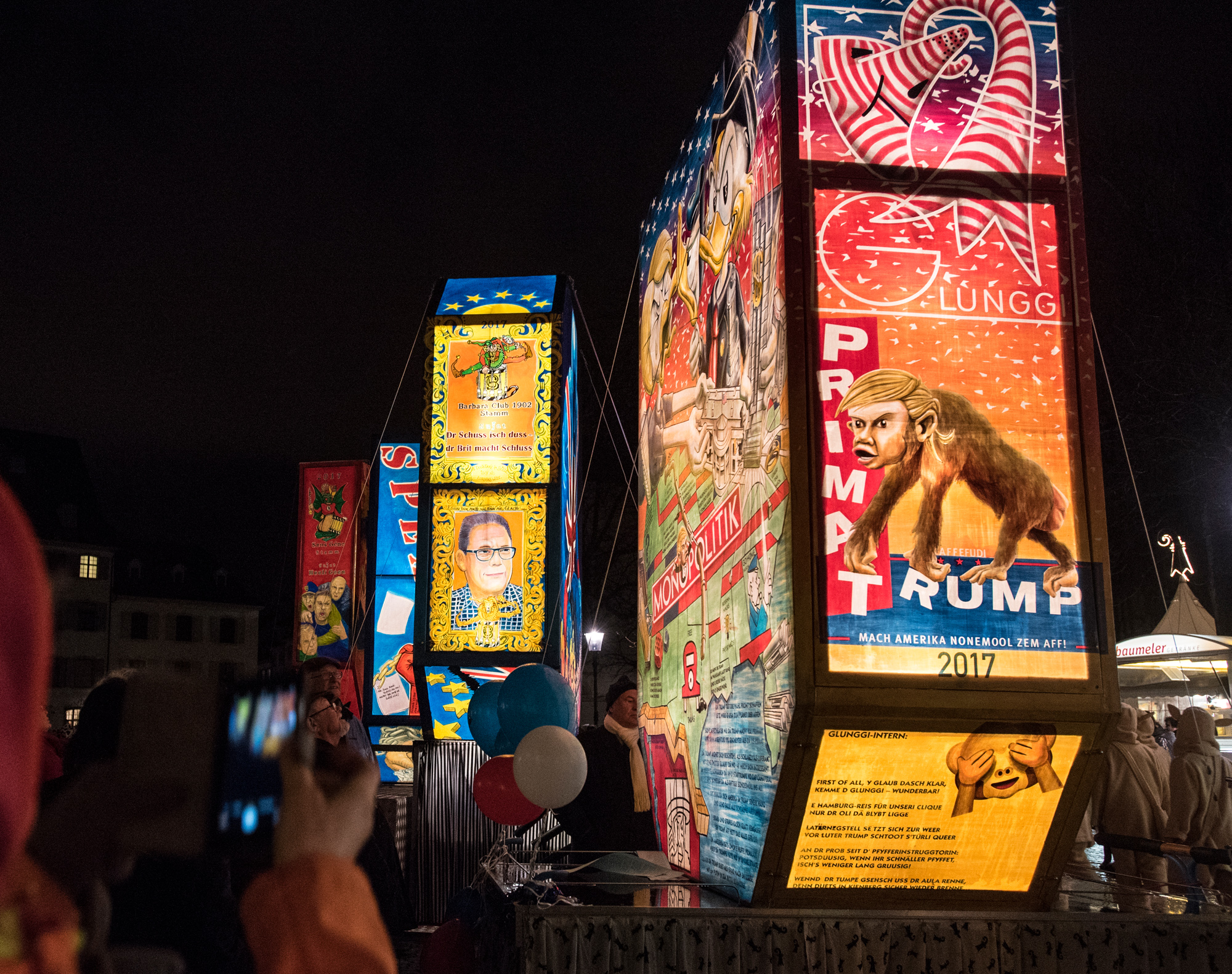 Inzwischen hat auch der Regen aufgehört. Alexander fängt mit seiner Kamera den Zauber der leuchtenden Laternen ein, und ich versuche mir einen Überblick über die verschiedenen Sujets zu verschaffen. Der vorläufige Befund: Ein bisschen Trump, etwas Brexit, (Zukunfts-)Ängste, aber auch: «D‘ Wält spinnt! – Mir nit!!! (oder doch?)».