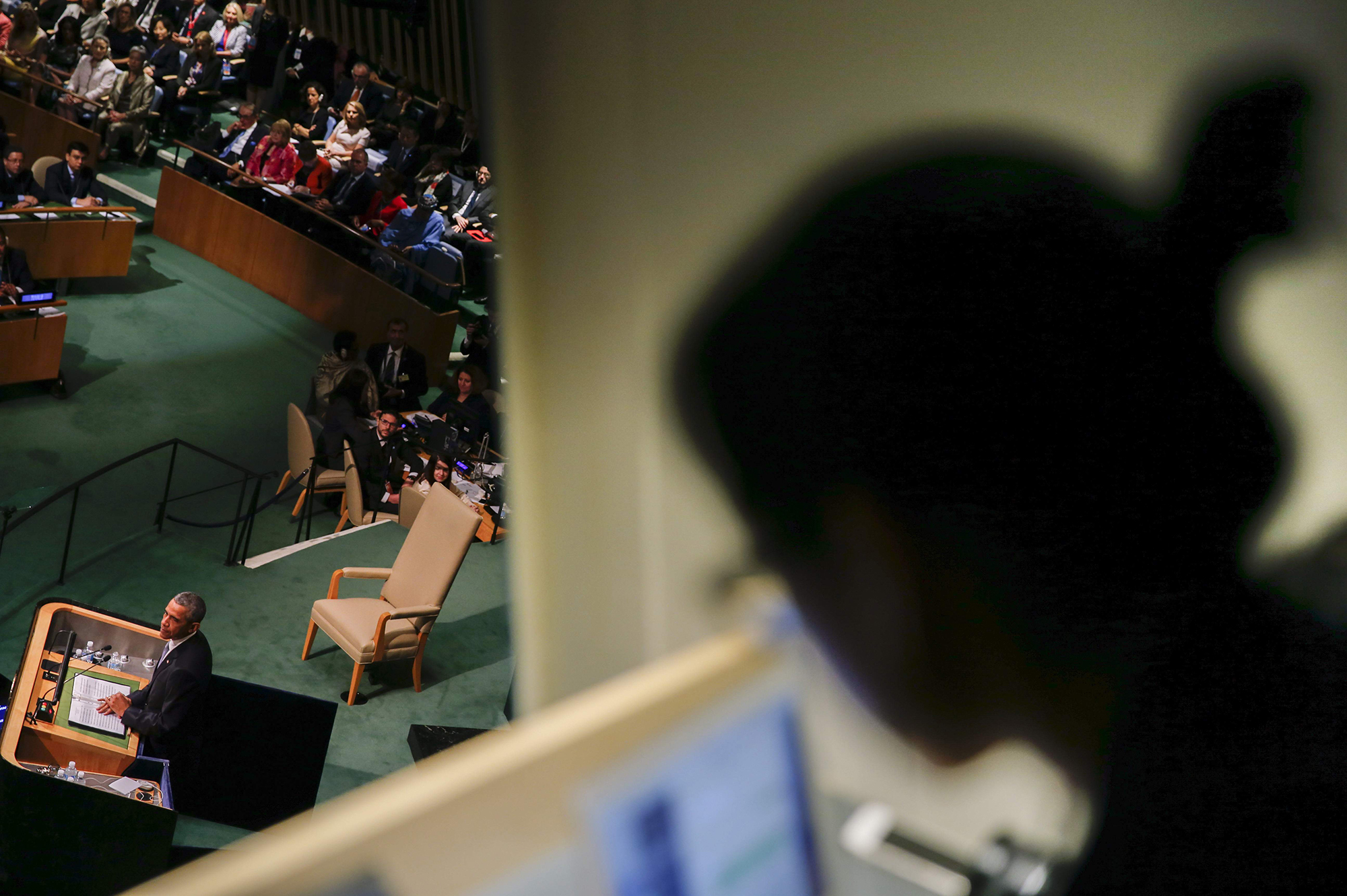 A journalist watches from a booth at the United Nations as U.S. President Barack Obama addresses attendees during the 70th session of the United Nations General Assembly at the U.N. headquarters in New York, September 28, 2015. REUTERS/Carlo Allegri (TPX IMAGES OF THE DAY)