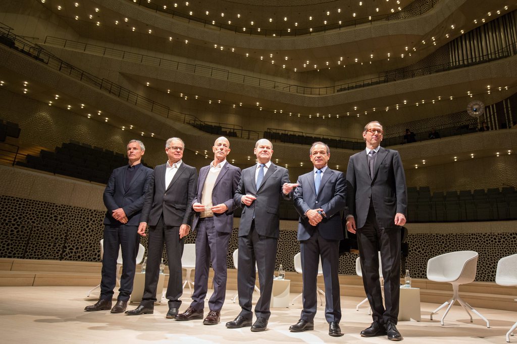 Ascan Megenthaler, Jacques Herzog und Pierre de Meuron aus Basel, der Hamburger Bürgermeister Olaf Scholz, der CEO von Hochtief, Marcelino Fernandes Verdes, und der Direktor der Elbphilharmonie, Christoph Lieben-Seutter, voller Stolz auf das Wunderwerk.