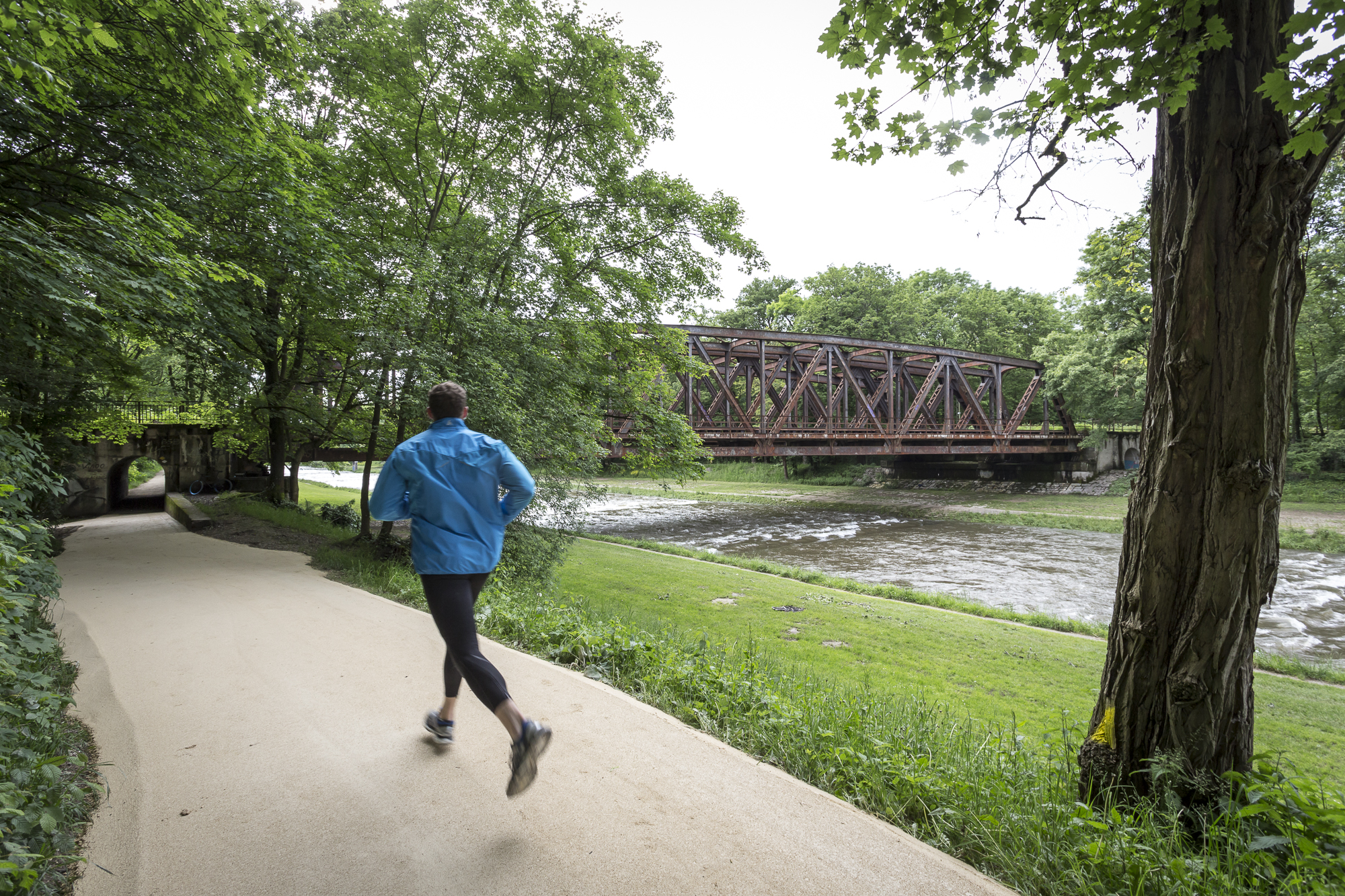 Neben der alten Brücke rauscht die moderne Zeit, darunter die Wiese.