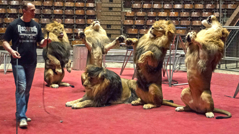 Lion tamer Oleksiy Pinko rehearses tricks with lions before their performance in a Kiev circus May 31, 2013. Pinko has trained seven lions for his performance in the circus where he dances with the lions and puts his head into a lion's open mouth. Picture (Bild: GLEB GARANICH)