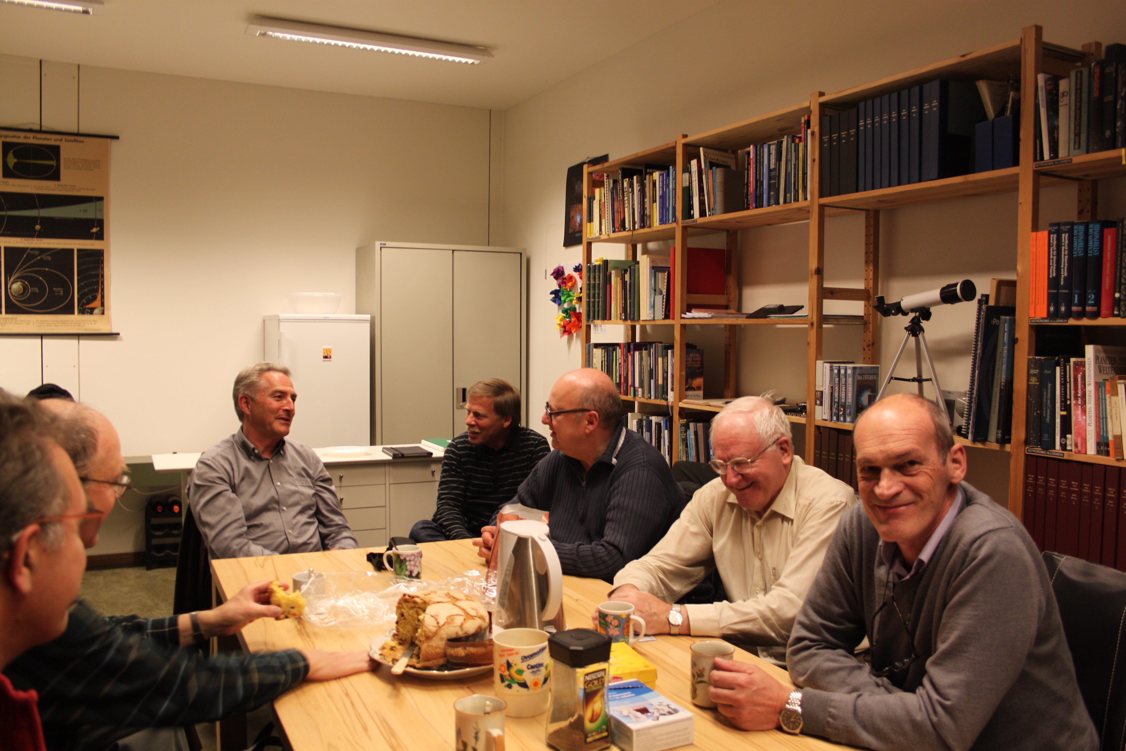 Gerade wird gefachsimpelt über Geräte, Literatur, Computerprogramme und über Alltägliches. Zum Vereinsleben gehören gemeinsame Unternehmungen, Führungen, Vorträge und natürlich die Pflege der Instrumente. Auf dem Gelände des Observatoriums stehen vier Schutzbauten mit je zwei Teleskopen und die grosse mobile Kuppel, die nur eines beinhaltet. Insgesamt siebenmal kann man also in klaren Nächten in die Sterne schauen.