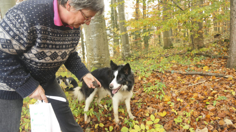 Hier kommen Enya und Titus ins Spiel. Titus ist der Anführer. Seine Ausbildung war unkompliziert, so erinnert sich Kathrin Bitterli. Sie habe ihm das «Trüffeln» selbst beigebracht. Das war vor zwei Jahren. Die Belohnung für den Hund ist ausgiebiges Lob: «Fein gemacht, guter Hund, toll, das ist ein Schöner», sagt sie, wenn er fündig wird. Hündin Enya hat sich das abgeschaut: «Enya hat gemerkt, dass etwas los ist, wenn es speziell stinkt und die Alte aus dem Häuschen ist», sagt Kathrin Bitterli. Seither sucht und findet auch Enya Trüffel.