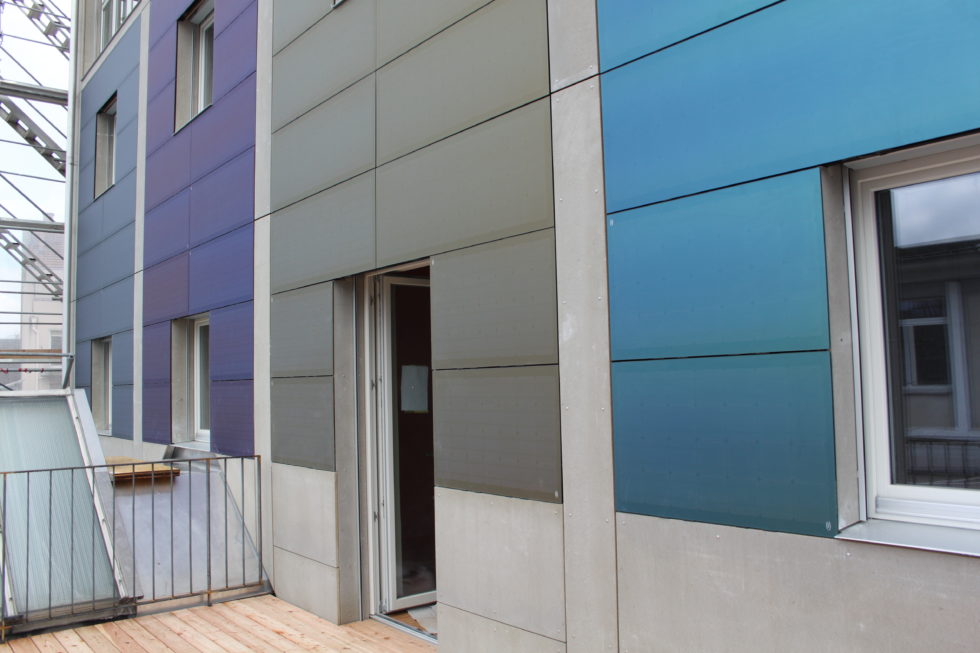 Sehenswertestes und bisher farbigstes Detail ist die mit Platten verkleidete Aussenfassade des Betonbaus. Hinter der Verkleidung verbirgt sich Hightech. Was aussieht wie eine hübsche Wandverschalung, sind farbige Solarpanels. Vom Hof aus kann man das nicht sehen. Auf dem Balkon im zweiten Stock kann man die Waben erkennen, wenn man sehr nah davor steht.