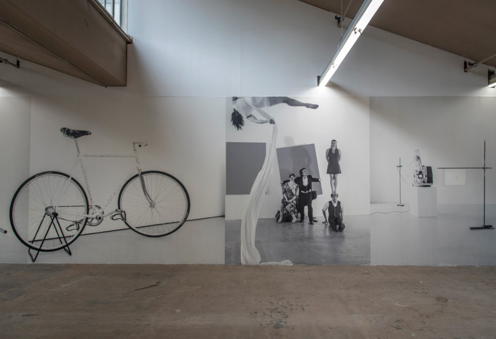 Trotzdem gibt es an einigen Stellen diese kleinen Verzerrungen, dort, wo eine Tapetenbahn auf die nächste trifft: Der Rahmen des Velos hat plötzlich einen Hick drin. Manche Verschiebungen sind vom Künstler aber auch geplant. Er spielt mit den unterschiedlichen Raumebenen – mit dem echten Raum und mit den Räumen in den Fotos, die er derart zusammenbringt, dass beispielsweise die eine fotografierte Treppe die reale Treppe des Kunsthauses aufnimmt oder die Kante zwischen Wand und Boden von einem Foto zum nächsten eine einzige Linie bildet.