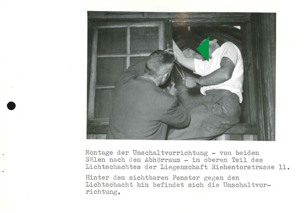 Es folgt eine über dreissigseitige Foto-Dokumentation aus dem Alltag eines Staatsschützers. Anschlüsse und Leitungen sind auf den Fotos eingetragen, die versteckten Mikrofone und Verstärker. Stolze Hinweise auf den elektronischen Zeitschalter, dank dem die Anlage nur jeweils von 18 bis 24 Uhr in Betrieb war. Das Fotoalbum beschränkt sich nicht auf technische Details. In hübschen Aufnahmen werden die rauchenden Beamten (Agenten!) beim Verlassen des Abhörraums gezeigt und schliesslich konzentriert und immer noch rauchend an ihren Schreibmaschinen im Spiegelhof.