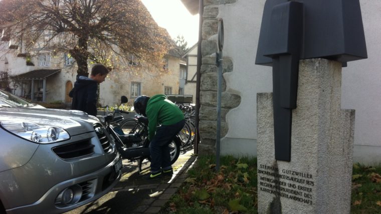 Darum haben wir uns am Samstag aufgemacht zum Dorfmuseum und dort hinter wuchtigen Autos irgendwann das Denkmal entdeckt. Und man muss sagen: interessant. Die Form: klar, aber keineswegs hart. Die Materialien: stark und doch leicht spielerisch, wie die Materialien ineinander übergehen. Da passt alles zusammen, wie, nein, natürlich nicht wie bei den beiden Basel, sondern bei sonst irgendwas. Nur etwas kopflos wirkt das Ganze. Aber urteilen Sie selbst (Bild oben).