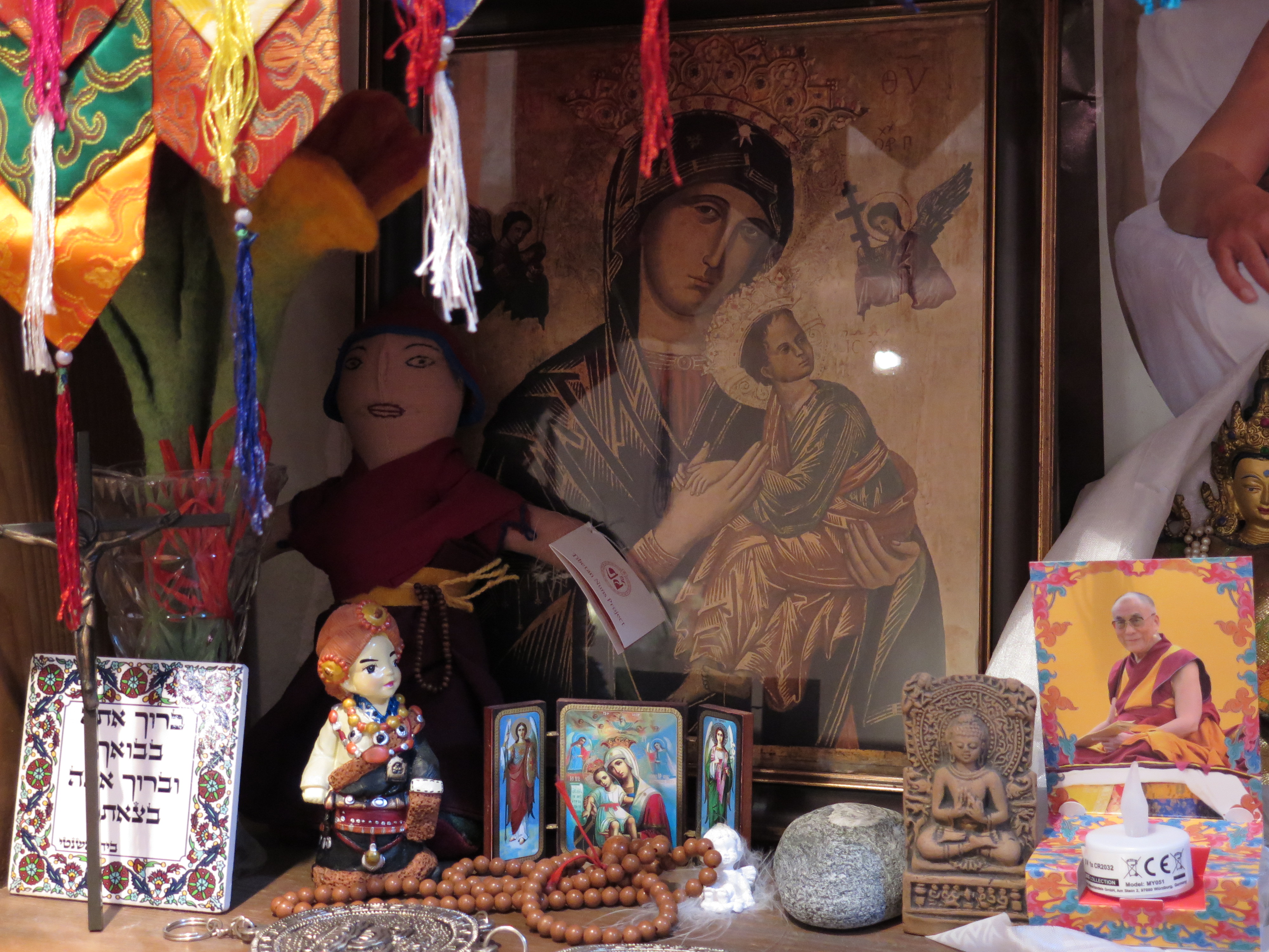 Er deutet auf seinen Altar im Wohnzimmer: Neben Figuren von Buddha und Bildern des Dalai Lama, haben auch Symbole aus anderen Glaubensrichtungen ihren Platz. Dennoch ist der Besuch beim Dalai Lama für ihn – wie für die grosse Mehrheit der Exil-Tibeter – eine Selbstverständlichkeit.