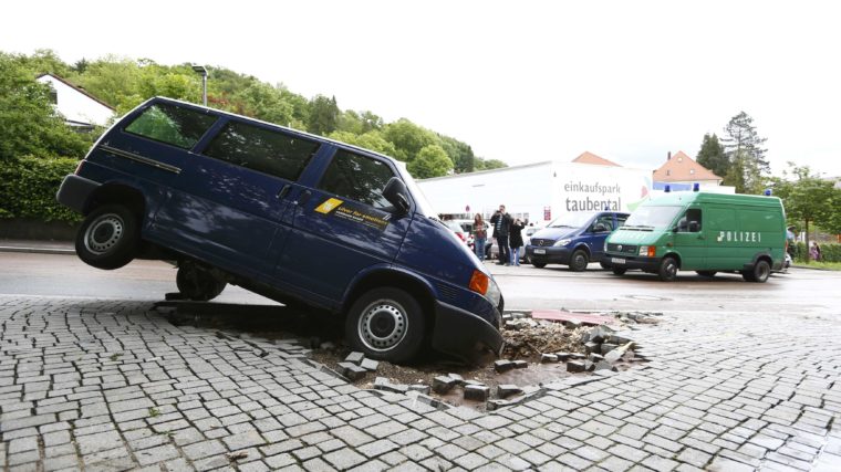 Dieser Transport ging ins Wasser. Dem Auto in Schwäbisch Gmünd in der Nähe von Stuttgart wurde eine von den Überschwemmungen zerstörte Strasse zum Verhängnis.
