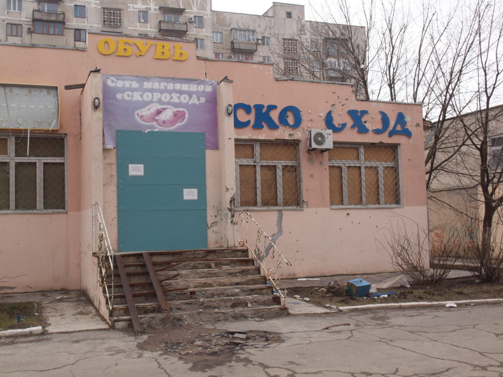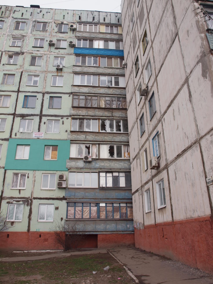 Die Mauern der Wohnblocks rings herum tragen Narben wie Pockengesichter. Die Trümmer der Grad-Raketen, die im Januar auf dem Wochenmarkt in Vostoschny eingeschlagen sind, haben sich wie glühende Nägel in den Beton gebohrt. Auf dem Markt selbst hinterlassen sie an diesem Tag einen Sumpf von Blut und zerfetzen Gliedmassen. Die Stadtverwaltung zählt dreissig Tote. Die Menschen in Vostochny glauben aber bis heute, dass es viel mehr gewesen seien.