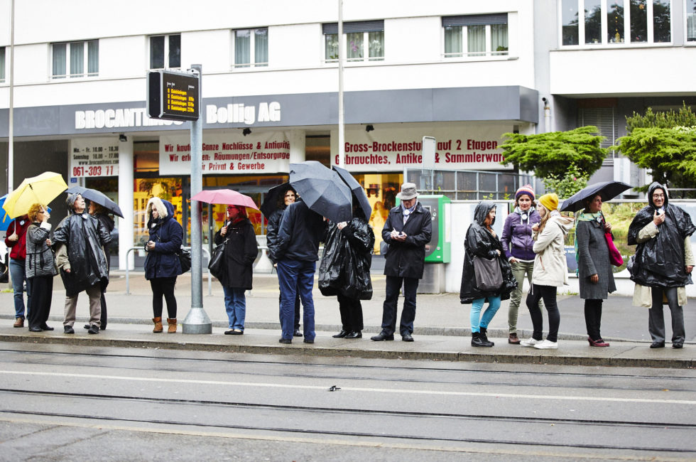 Treffpunkt ist (bzw. war, denn leider handelt es sich nur um eine einmalige Aktion) das «Motel» auf dem Kasernenplatz. Im Hintergrund singt der «Surprise»-Strassenchor afrikanische Lieder (siehe Video unten), während der Regen einsetzt und Regisseur Patrick Gusset neben Funkkopfhörern die, in diesen Tagen für Aussenproduktionen obligaten Regenpellerinen verteilt. Das Motel ist Festivalzentrum von Wildwuchs und Andockstelle für die «Störmobile», die als Aussenstationen des Festivals eigene Projekte kreierten. Das Publikum wird in zwei Gruppen aufgeteilt – und auf geht’s zum Tram, drei Stationen in Richtung Norden bis zur Dreirosenbrücke.
