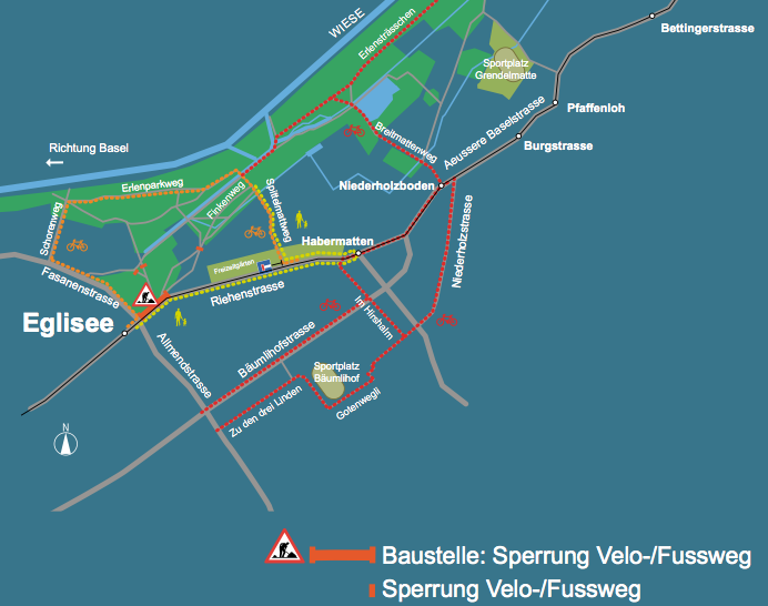 Eine Baustelle zwischen der Tramhaltestelle Eglisee und Riehen versperrt nicht nur einen wichtigen Zugang zur Langen Erlen, sondern auch einen viel benutzten Fahrradweg. Die weitläufigen Umleitungen verärgern so einige. Die Kantonspolizei sucht nun nach einer Lösung.