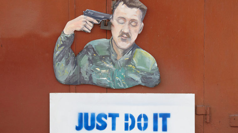 Als immer mehr Menschen aus Donezk flüchteten, wurden sie immer zahlreicher: Clowns und Zombies, in Camouflage und mit Sturmhauben. Lebensgroß, aus Spanplatten ausgesägt, an Zäune und Hauswände montiert. Die Donezker Innenstadt wurde bevölkert von Figuren mit Kalaschnikows, Raketenwerfern, diabolischem Blick und gefletschten Zähnen.