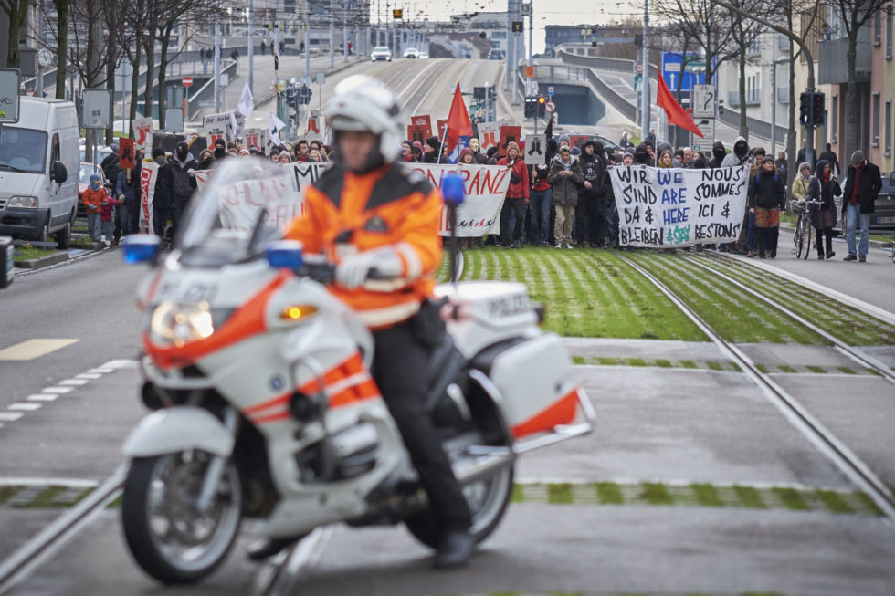 Am Bässlergut endete der Demonstrationszug, der sich nach 16 Uhr vor der Matthäuskirche gebildet hatte. Wieder war es eine heterogene Gruppe, die sich für das Bleiberecht von Asylsuchenden einsetzte. Aber anders als am Donnerstag liess die Polizei die Kundgebung gewähren. Damals schossen die Beamten mit Gummischrot in den friedlichen Protestzug, jetzt blieben sie beinahe unsichtbar. Ausser einem Polizeibeamten, der dem Demonstrationszug auf dem Motorrad vorausfuhr, waren zunächst keine Polizisten zu sehen.