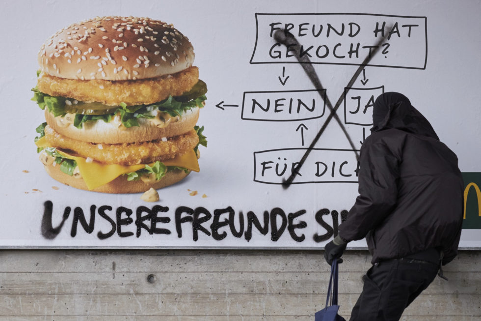 Andrer Freundeskreis: Übersprayte McDonald's-Werbung.