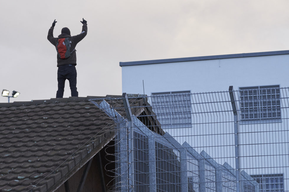 Dachsturm: Ein Aktivist protestiert auf einem Seitenbau des Asylgefängnisses Bässlergut.
