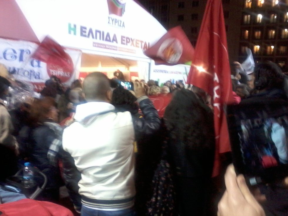 Ich bin noch immer ganz aufgeregt und aufgewühlt von meinen Erlebnissen am Athener Wahltag. Ich bin erst nach 16 Uhr von Ilisia in die Innenstadt aufgebrochen und hatte eigentlich nur ein Ziel: das Syriza-Wahlkampfzelt am Karitsi-Platz. Gleich als ich aus der Metrostation Panepistimiou trat, sah ich ein Grossaufgebot an internationalen Medienvertretern. Im Zelt überwogen zunächst noch die Anhänger von Syriza, je näher aber die Schliessung der Wahllokale rückte, desto mehr Journalisten drängten hinein. Ab 18.30 Uhr war dort kein Durchkommen mehr. Als um 19 Uhr die ersten Prognosen, die einen Wahlsieg mit 35,5 bis 39,5 % der Wählerstimmen verhiessen, via Fernsehen auf einer Grossleinwand bekannt wurden, brach die Menge in enthusiastischen Jubel aus. Mich selber überkam ein Gänsehautgefühl und eine unbestimmte Freude. Einen Moment später dachte ich, dass ich mich niemals mehr als Europäer empfunden habe als hier und jetzt. Dieses Gefühl wurde fraglos von der Internationalität der Anwesenden mitverursacht. Neben Medienleuten aus aller Welt waren auch zahlreiche Vertreter europäischer Linksparteien angereist, etwa aus Italien, Spanien, Deutschland oder Frankreich. Sie alle wollten miterleben, wie die Griechen ein Zeichen setzen gegen eine vom Kapital bestimmte Politik. Und wie erwartet wählte Griechenland Syriza und deren Hoffnungsträger Alexis Tsipras. Ein historischer Tag für das Land und vielleicht auch für Europa. Wie erlebst du den Wahlabend aus der Ferne? Schauen Kostas und du die aktuellen Berichte im Fernsehen?