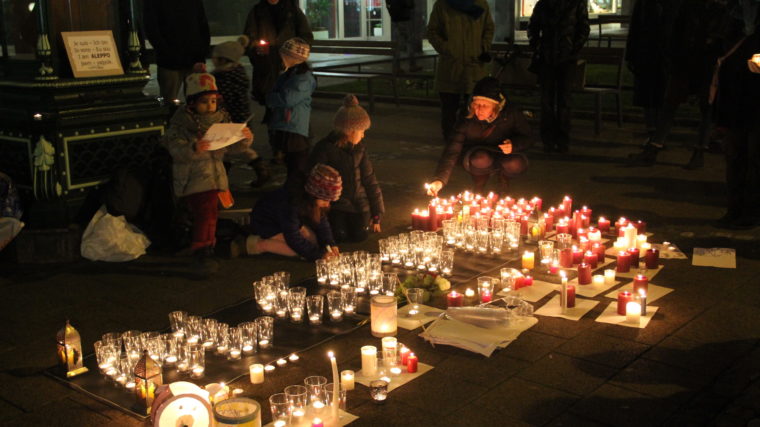 Kurz nach Ladenschluss stand der Claraplatz während einer Stunde nicht nur im Zeichen der Weihnachtsvorfreude: Teelichter und Kerzen formten den Namen einer Stadt, deren Schicksal die Weltöffentlichkeit in den letzten Tagen sehr mitgenommen hat. Das Wort «Aleppo» flackerte am Samstagabend vor dem Wetterhäuschen. Die Nachrichten aus der zweitgrössten Stadt Syriens bewegten die Gemüter. An einer spontan organisierten Mahnwache erinnerten daher rund 70 Personen an die getötete, eingekesselte und vertriebene Zivilbevölkerung im Ostteil Aleppos.