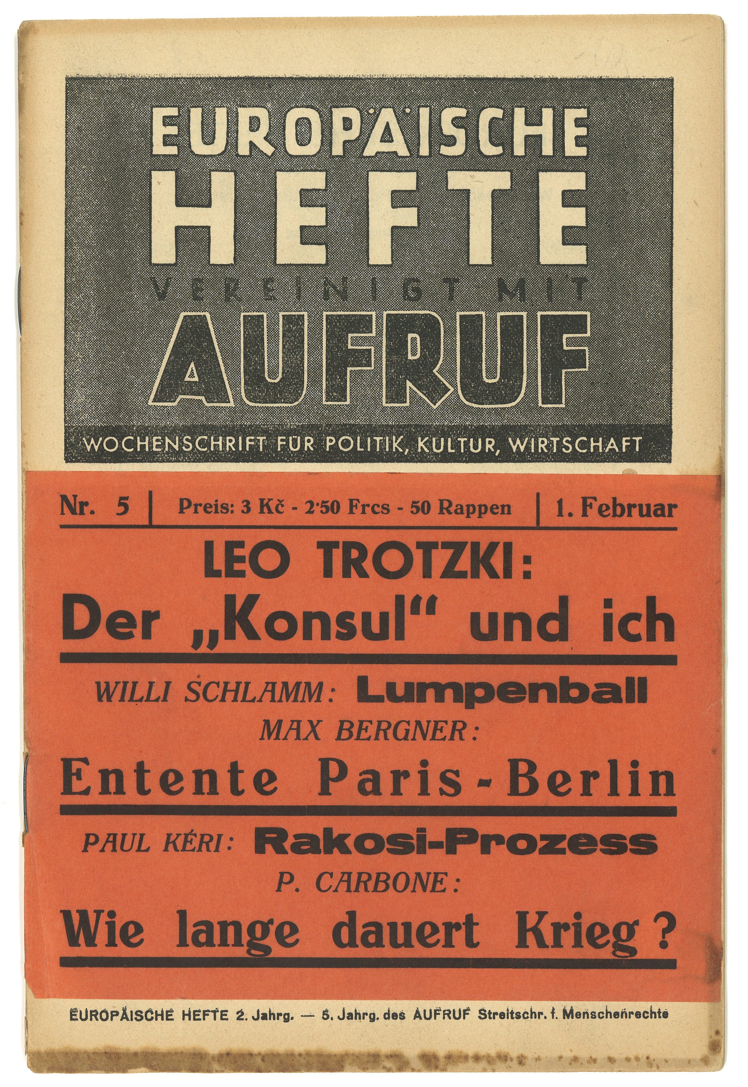 Mit Leo Trotzki kam in den «Europäischen Heften» ein, wenn auch umstrittenes und teilweise gar verfemtes, politisches Schwergewicht zu Wort. Der einstige Volkskommissar und Gründer der Roten Armee war als Gegner Stalins 1927 politisch kaltgestellt und 1929 aus der UdSSR verbannt worden. Im Text «Der ‹Konsul› und ich» bezog sich Trotzki auf den Prozess gegen den Mörder des Leningrader Parteisekretärs Sergei Kirow. In diesem Verfahren war angedeutet worden, dass ein nicht namentlich genannter «Konsul» den Attentäter ermuntert habe, mit Trotzki brieflich in Kontakt zu treten. In Trotzkis Augen ein stümperhafter Versuch, ihn und seine Anhänger in die Nähe von Terroristen zu rücken.