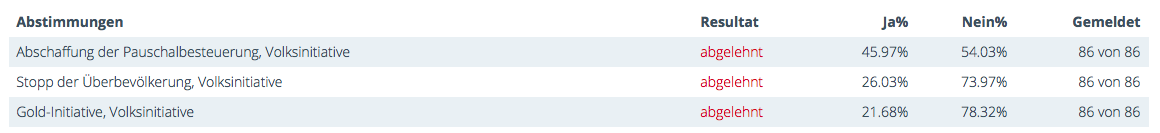 Kurz vor 14 Uhr war die Spannung am Abstimmungssonntag draussen. Die eidgenössischen Vorlagen scheiterten bereits am Ständemehr. Die Schlussresultate waren letztlich aber nicht weniger deutlich: 77,3 Prozent lehnten die Goldinitiative ab, 74,1 Prozent Ecopop und Pauschalbesteuerung wollten – mit Ausnahme von Schaffhausen – 59,2 Prozent nicht abschaffen. Reaktionen und Erklärungsversuche von Gegnern und Befürwortern zu den einzelnen Vorlagen: