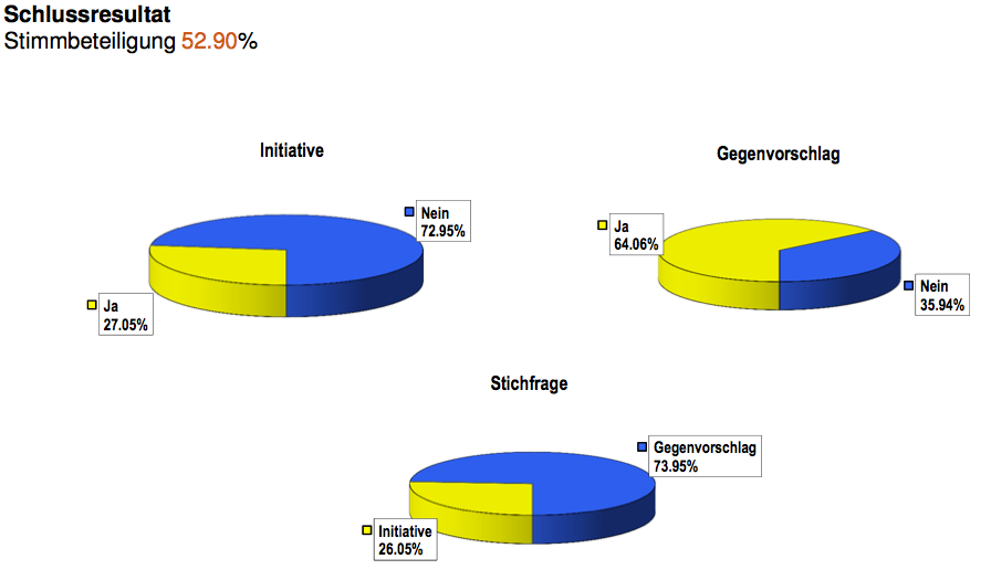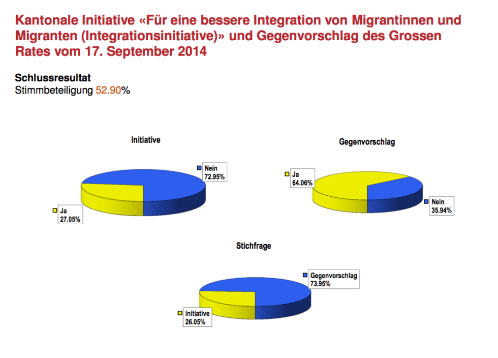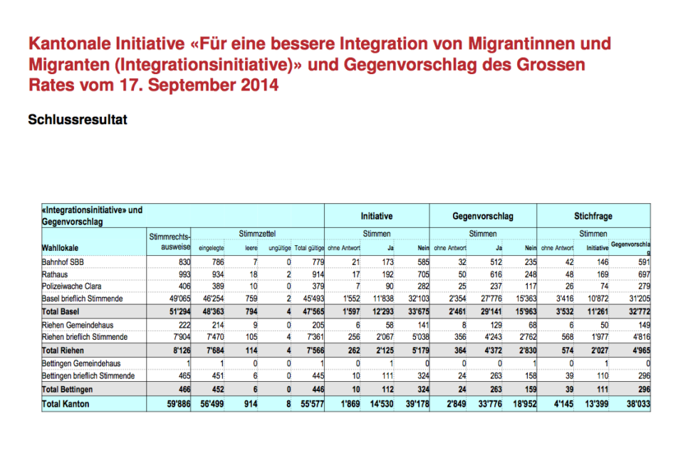 Die Schlussresultate für Basel-Stadt liegen vor, demnach will die Mehrheit der Basler Bevölkerung gratis Deutschkurse für Migranten. Das Stimmvolk hat die SVP-Integrationsinitiative mit einem Stimmenmehr von 72,95 Prozent abgelehnt, den Gegenvorschlag aber mit 64,06 Prozent angenommen (was der Gegenvorschlag im Gegensatz zur Initiative will im Detail).