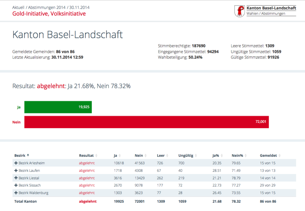 Detailergebnisse zu den Abstimmungen im Baselbiet: Abschaffung der Pauschalbesteuerung / Ecopop-Initiative / Gold-Initiative oder in der Bildstrecke mit Übersicht zu Bezirken.