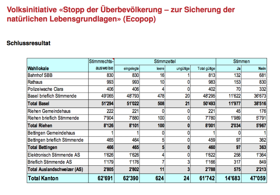 Der Trend nach der Auszählung der Briefstimmen in Basel-Stadt hat sich bestätigt: Ecopop wird deutlich abgelehnt (76, 22 Prozent Nein-Stimmen) wie auch die Goldinitiative (78,61 Prozent Nein-Stimmen), knapp abgelehnt wird auch die Abschaffung der Pauschalbesteuerung (54,91 Prozent). Die Resultate zu den eidgenössischen Abstimmungen im Detail in der Bildstrecke.