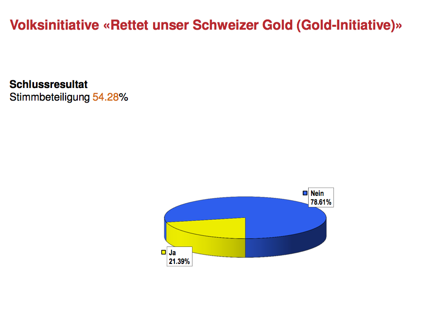 - Goldinitiative: «Die Bevölkerung wollte keine Abenteuer eingehen», sagte Nationalrat Urs Gasche (BDP/BE) vom Gegenkomitee. Tatsächlich scheiterte die von SVP-Exponenten lancierte Initiative deutlich. Sie habe dennoch etwas gebracht, sagte Luzi Stamm, Aargauer SVP-Nationalrat und Mitglied des Initiativkomitees. Die Nationalbank habe klar offengelegt, wo sie ihre Goldbestände lagere.