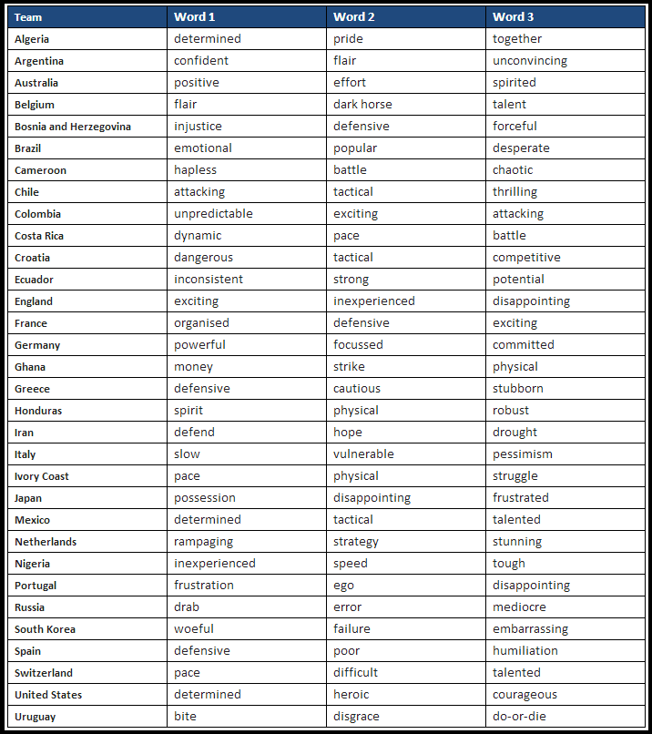 Wir nicht. Aber die Fachleute der Cambridge University Press. Die haben während der WM laut eigenen Angaben Abermillionen von Wörtern auf Internet-Nachrichtenseiten durchkämmt und pro Nation jene drei Begriffe gesammelt, die am häufigsten verwendet wurden, um die jeweilige Mannschaft zu beschreiben.